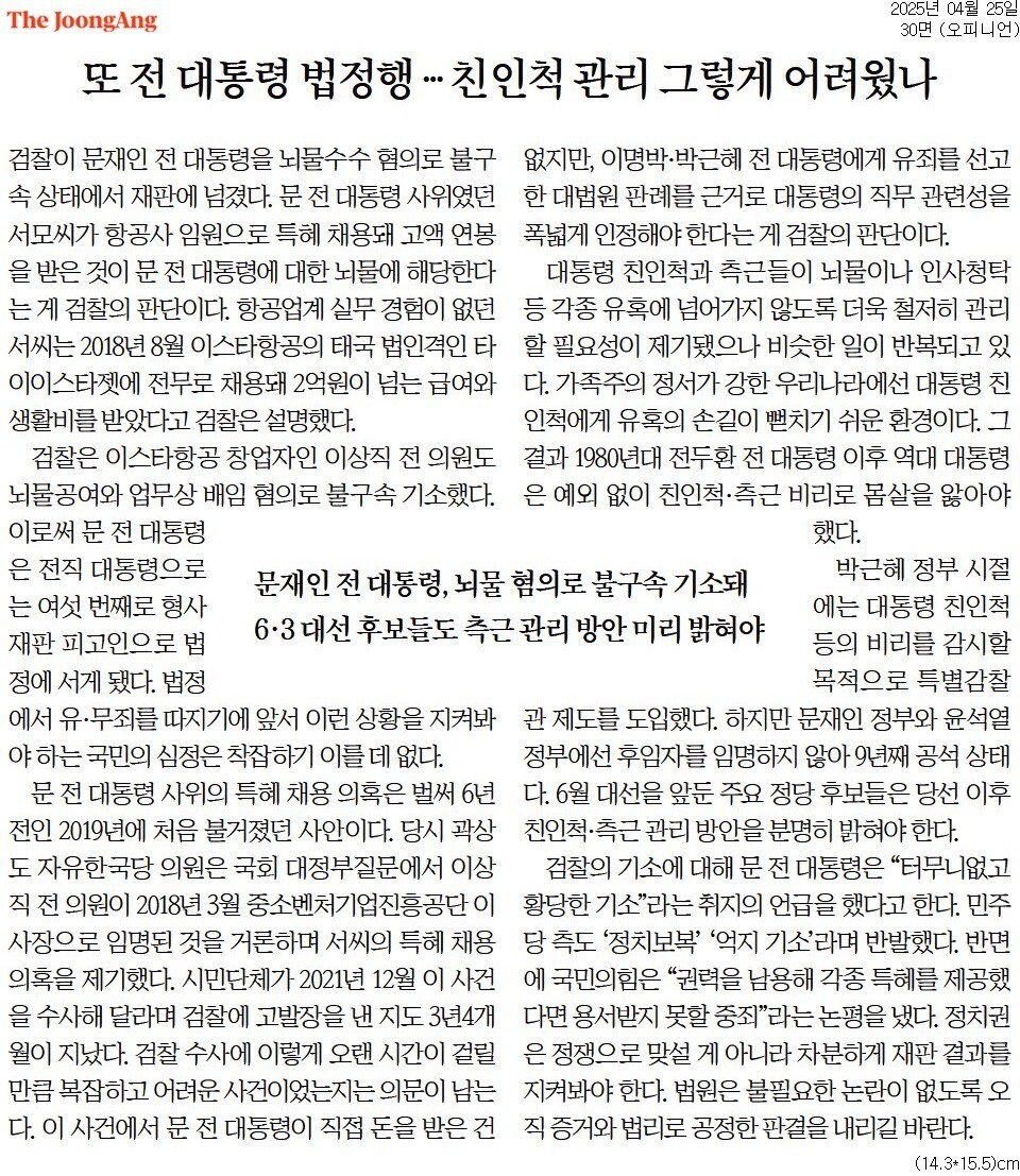 - 경향, 한겨레가 1면 톱으로 썼습니다. 동아일보의 제목이 사건 내용만을 드라이하게 전한 수준입니다. 조선일보 제목은 제목만 보면, 문 전 대통령이 마치 ‘2억원 현금 뇌물’을 받은 것 같은 늬앙스를 풍깁니다.