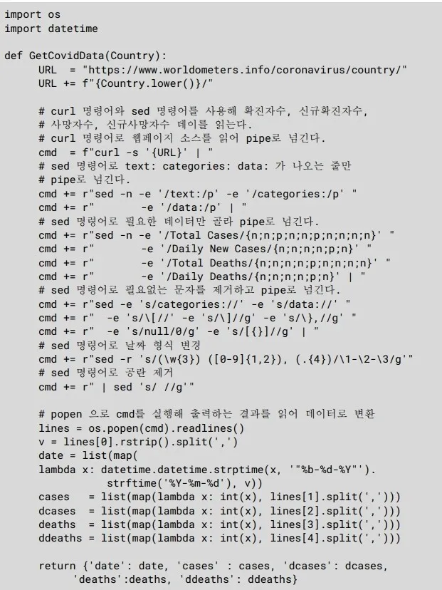 CovidDataWorldometer.py: curl 명령어를 이용해 원하는 나라의 코로나19 데이터가 있는 웹페이지 소스를 내려받은 후, sed 명령어를 이용해 웹페이지 소스에서 누적 확진자수, 신규 확진자수, 누적 사망자수, 신규 사망자수를 걸러내 내보내는 함수 GetCovidData를 담고 있다.